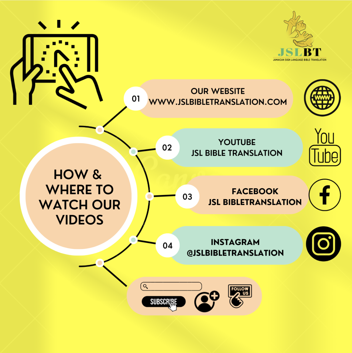 We are an organisation driven by our purpose to make God’s Written Word alive in Sign Language. This is realised through our priorities of producing video resources in Jamaican Sign Language (JSL)-Country Sign (CS), translating the Bible, spiritual formation content, and educational support content in the heart language of the Jamaican Deaf Community. Our mission is that our audience experience "light bulb" moments and growth in relationships with God and with others.